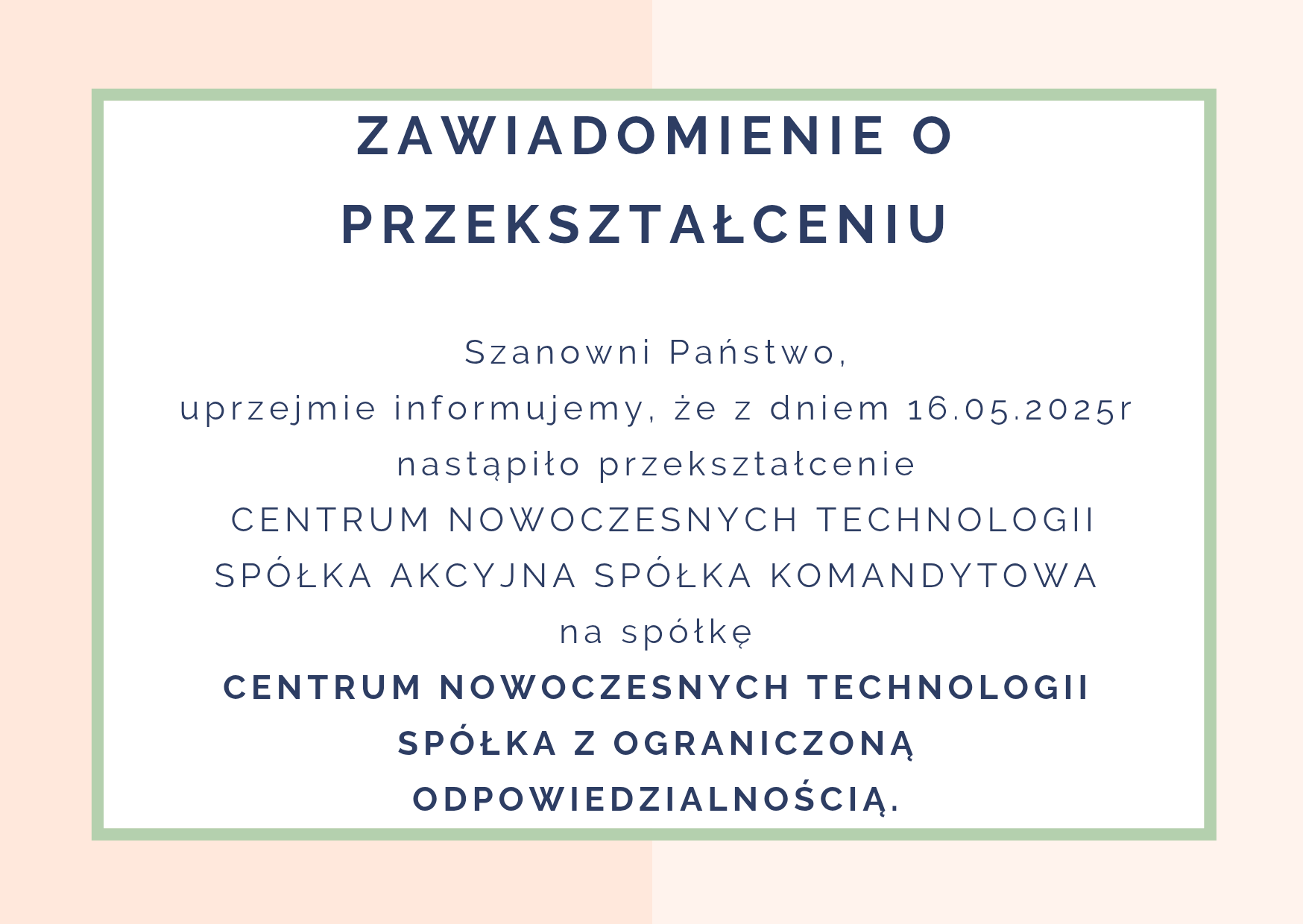 W imieniu Centrum Nowoczesnych Technologii Spółki z ograniczoną odpowiedzialnością z siedzibą w Sosnowcu przy ul. Niweckiej 14, wpisanej do rejestru przedsiębiorców prowadzonego przez Sąd Rejonowy w Katowicach Wschód, VIII Wydział Gospodarczy Krajowego Rejestru Sądowego, pod numerem KRS 0001170019, NIP 6443516579, REGON 364137493, niniejszym na podstawie art. 504 k.s.h. po raz drugi zawiadamiam swojego jedynego wspólnika o zamiarze połączenia Centrum Nowoczesnych Technologii Sp. z o.o. („Spółka Przejmowana”) z Centrum Nowoczesnych Technologii Spółką Akcyjną z siedzibą w Lublinie, ul. Krakowskie Przedmieście 37, 20-076 Lublin, wpisaną do rejestru przedsiębiorców prowadzonego przez Sąd Rejonowy w Lublinie Wschód, VI Wydział Gospodarczy Krajowego Rejestru Sądowego, pod numerem KRS 0000143061, NIP 6440011838, REGON 271122279 („Spółka Przejmująca”), w trybie art. 492 § 1 pkt 1 w zw. z art. 516 § 1 i § 6 k.s.h., tj. poprzez przejęcie całego majątku Spółki Przejmowanej przez Spółkę Przejmującą z uwzględnieniem procedury uproszczonej uregulowanej w art. 516 § 1 i § 6 k.s.h., zgodnie z ustaleniami podjętymi w planie połączenia z dnia 22.09.2025 r. ogłoszonym na stronie internetowej CNT Spółki z o.o. w dniu 26.09.2025 r.